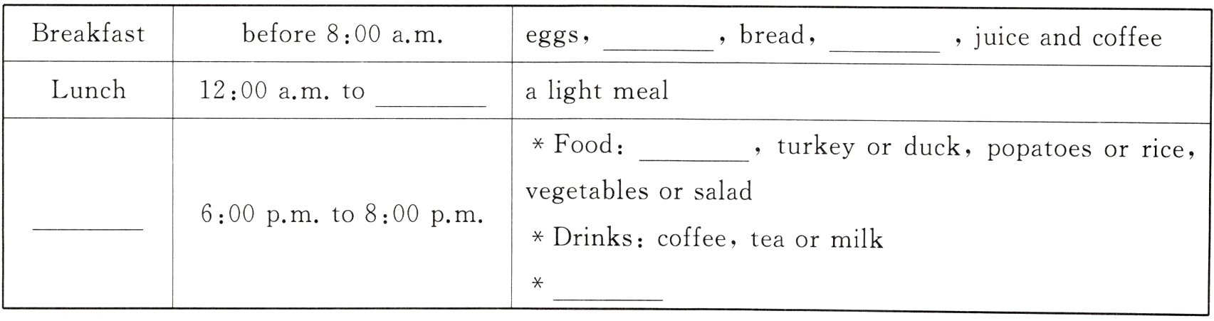 任务二:meat; fruit; 1:00 p.m.; Supper/Dinner; chicken; Dessert(横向开始)