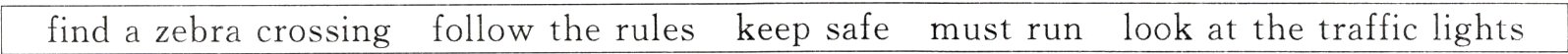 1.followed the rules 2.look at the traffic lights 3.mustn't run 4.keep safe 5.found a zebra crossing
