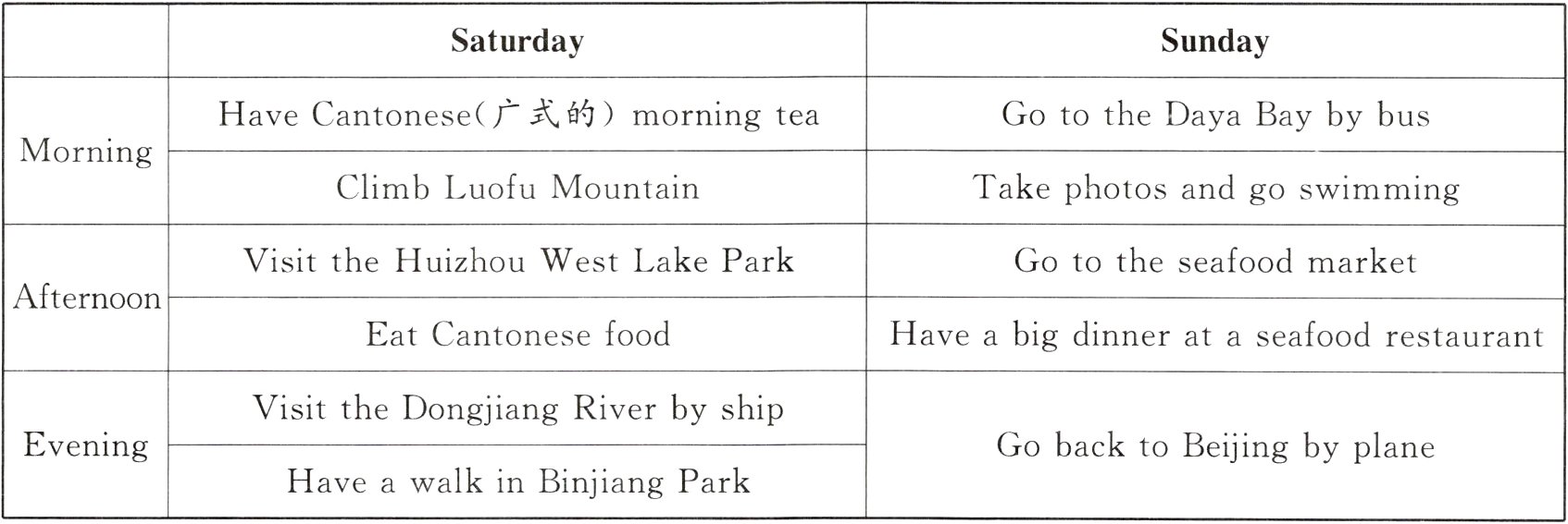 The weekend is coming. Sam and Bobby are going to visit Huizhou, Guangdong. This is one part of their schedule(行程表).