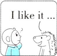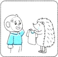 (H) But Hedgehog isn't wearing the T - shirt, so Monkey asks, “Hedgehog, don't you like my present?” Hedgehog gives him a big smile and says, “I like it very much! But ... I don't want to make holes on the T - shirt.”