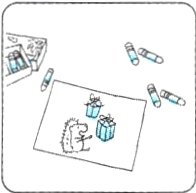 (G) After that, everyone draws a picture together with Hedgehog's new crayons.