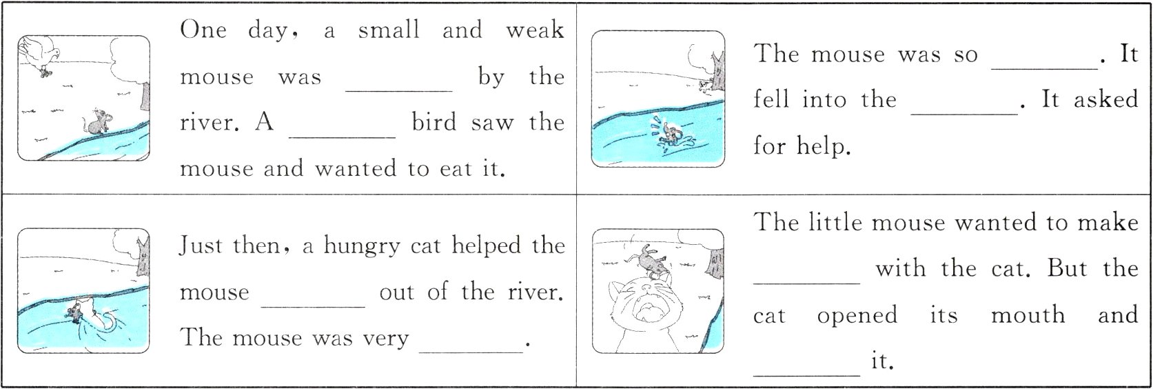 ![img id=3] Just then,a hungry cat helped the mouse ________ out of the river. The mouse was very ________.