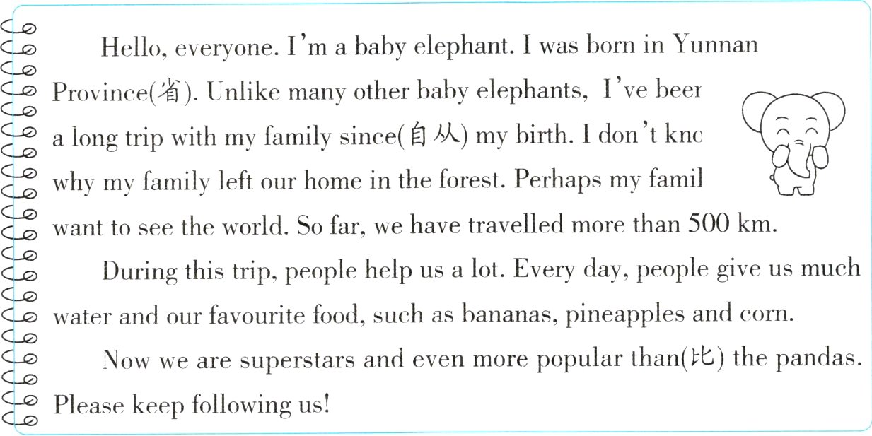 Hello, everyone. I'm a baby elephant. I was born in Yunnan Province(省). Unlike many other baby elephants, I've been a long trip with my family since(自从) my birth. I don't know why my family left our home in the forest. Perhaps my family want to see the world. So far, we have travelled more than 500 km.