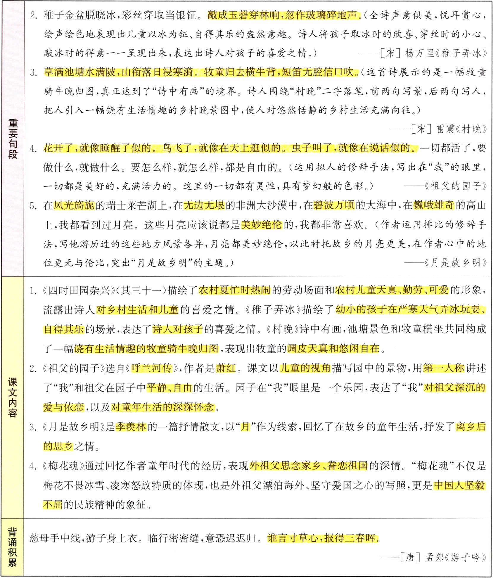 1. 《四时田园杂兴》(其三十一)描绘了农村夏忙时热闹的劳动场面和农村儿童天真、勤劳、可爱的形象,流露出诗人对乡村生活和儿童的喜爱之情。《稚子弄冰》描绘了幼小的孩子在严寒天气弄冰玩耍、自得其乐的场景,表达了诗人对孩子的喜爱之情。《村晚》诗中有画,池塘景色和牧童横坐共同构成了一幅饶有生活情趣的牧童骑牛晚归图,表现出牧童的调皮天真和悠闲自在。