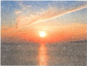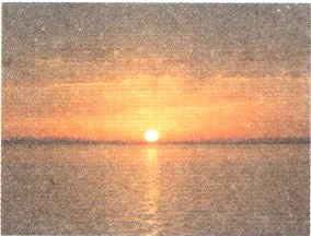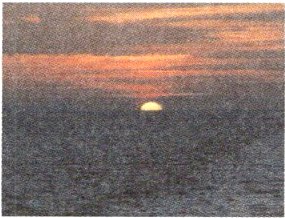 上升,到了最后,终于冲破了云霞,完全跳出了海面,颜色红得非常可爱。一刹那间,这个深红的圆东西,忽然发出了夺目的亮光,射得