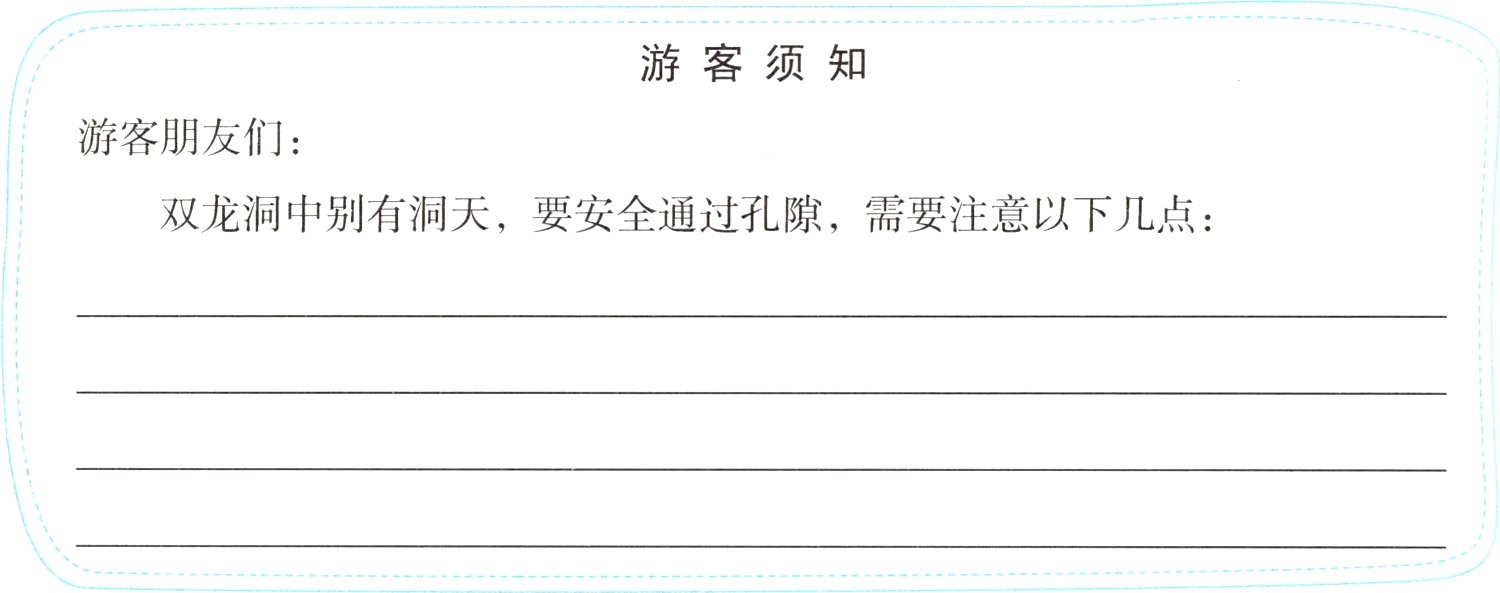 三、1.游览 外 内 2.C 3.狭小 低矮通过孔隙进内洞时感觉受到挤压而内心紧张 4.不可以。“贴”字说明仰卧的姿势没法儿再低了,突显出孔隙的狭小、低矮。换成“挨”字,则没有这种表达效果。 5.示例:①游客上下船必须听从工作人员的安排。②每次乘船进洞最多两人,不得超员。③游客上船后,必须躺下,头、肩、背、臀、脚跟等部位必须紧贴船底。④行船过程中,游客身体的任何一个部位都不能抬起,尤其是头部。