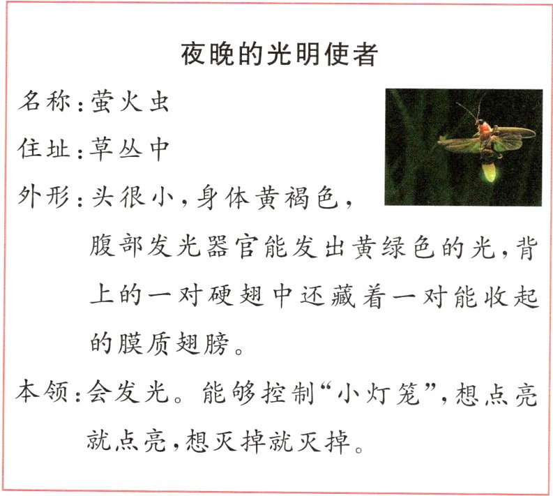 五、1. 名称 住址 外形 本领 2. 很小 黄褐 膜质翅膀 3. 黄绿色 4. 它能在夜晚发光