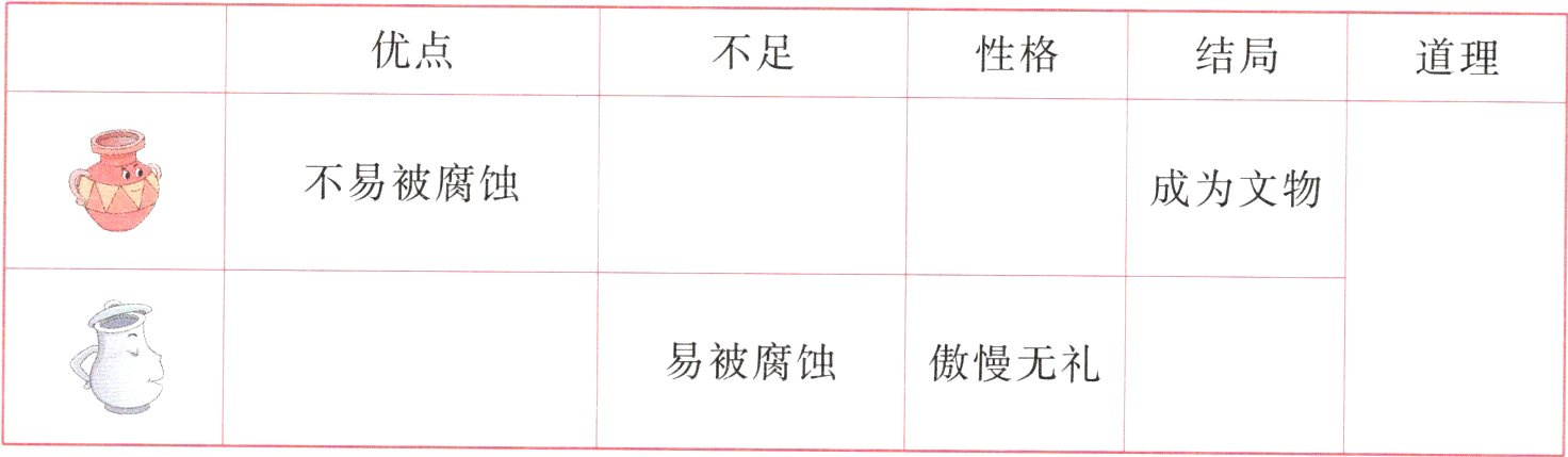 四、新思维 逻辑梳理 陶罐总结了自己与铁罐的特点。结合课文内容完成下面的表格。