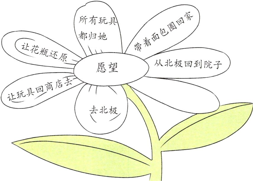 1. 让小男孩健康起来 2. (涂色提示)让花瓶还原:红色 所有玩具都归她:橙色 带着面包圈回家:黄色 从北极回到院子:绿色 让小男孩健康起来:青色 去北极:蓝色 让玩具回商店去:紫色 3. 示例:希望妈妈不要这么累 妈妈每天要照顾我,还要上班,太累了,我希望她可以好好休息休息