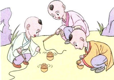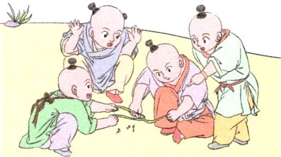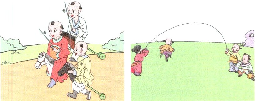 图片依次连:骑竹马 跳百索 斗草 抽陀螺