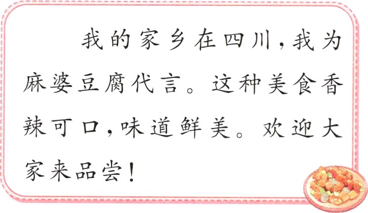我的家乡在四川,我为麻婆豆腐代言。这种美食香辣可口,味道鲜美。欢迎大家来品尝!