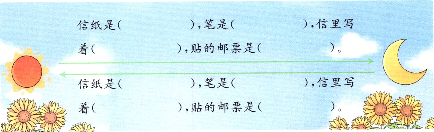 5. 阅读要素·白天或夜晚会发生什么有趣的事?请你展开想象,用上下面的词语,写一写“太阳给月亮的信”或“月亮给太阳的信”,讲一讲他们那边的趣事吧!