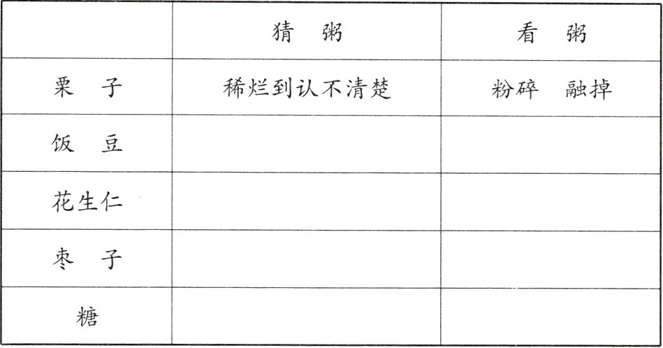1. 这段文字主要描写了八儿猜粥和看粥的情景,这两部分是对比着写的。请仔细阅读,在表格中填写关键词,想想这样写的好处。