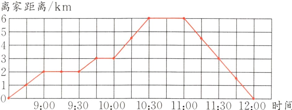 (3)根据“速度 = 路程÷时间”得到小兔去外婆家的平均速度:10时30分 - 8时30分 = 2时,6÷2 = 3(千米/时);返回的速度:12时 - 11时 = 1时,6÷1 = 6(千米/时)。