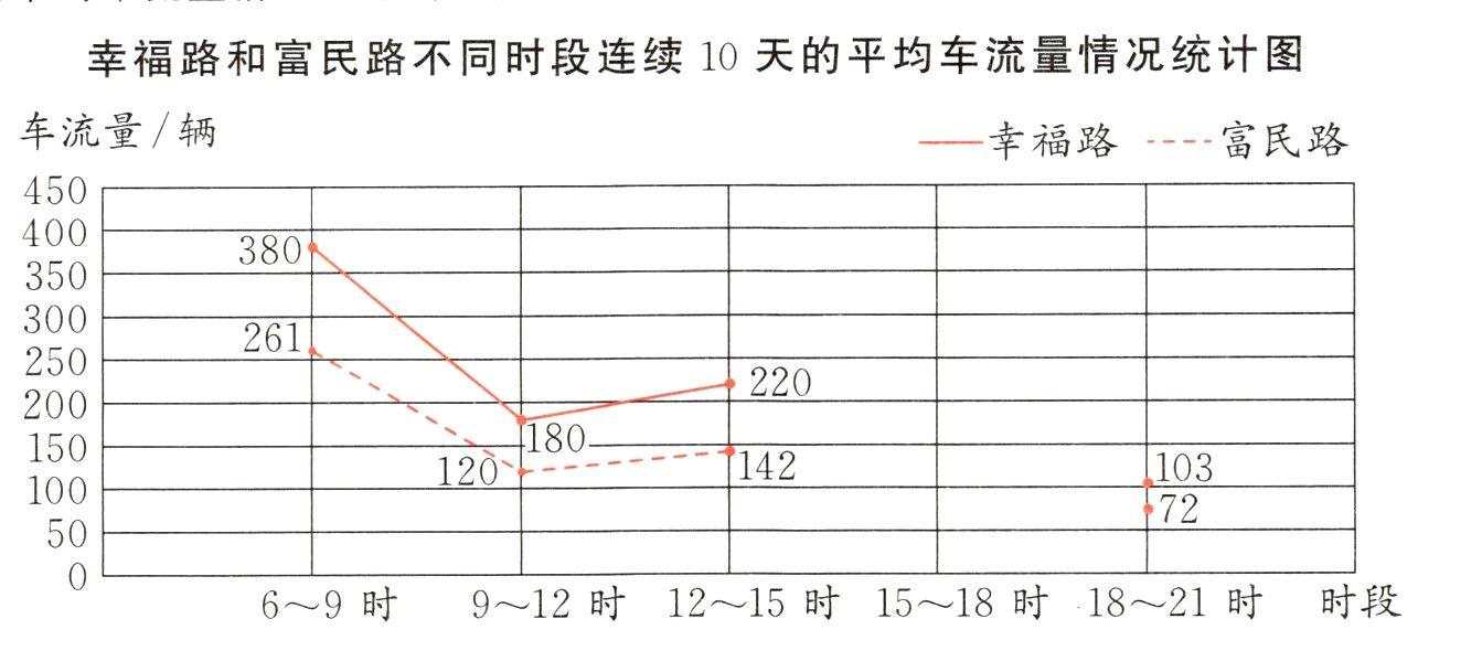 (2) 幸福路和富民路不同时段连续10天的平均车流量情况统计图