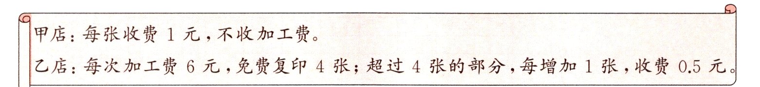 4. 答:当李老师复印的试卷少于8张时,去甲店复印更合算;当复印的试卷等于8张时,去甲店或乙店一样合算;当复印的试卷多于8张时,去乙店复印更合算。