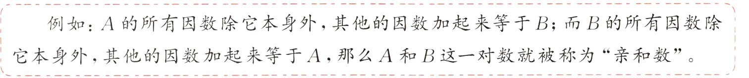 例如:A的所有因数除它本身外,其他的因数加起来等于B;而B的所有因数除它本身外,其他的因数加起来等于A,那么A和B这一对数就被称为“亲和数”。