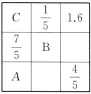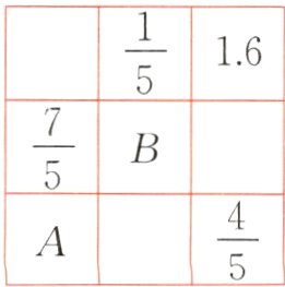 我们可设左上角的数为C,根据题意可得,$C+\frac{1}{5}+1.6=C+B+\frac{4}{5}=C+\frac{7}{5}+A$,进而可得出$B+\frac{4}{5}=\frac{1}{5}+1.6$和$A+\frac{7}{5}=\frac{1}{5}+1.6$,解得$A=\frac{2}{5}$,$B=1$。