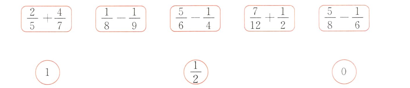 $\frac{2}{5}+\frac{4}{7}$ $\frac{1}{8}-\frac{1}{9}$ $\frac{5}{6}-\frac{1}{4}$ $\frac{7}{12}+\frac{1}{2}$ $\frac{5}{8}-\frac{1}{6}$