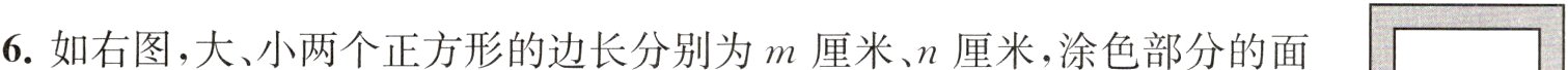6. 如右图,大、小两个正方形的边长分别为$m$厘米、$n$厘米,涂色部分的面积是( )平方厘米。