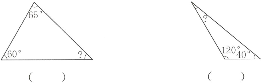 4. 算出每个三角形中未知角的度数,填在括号里。