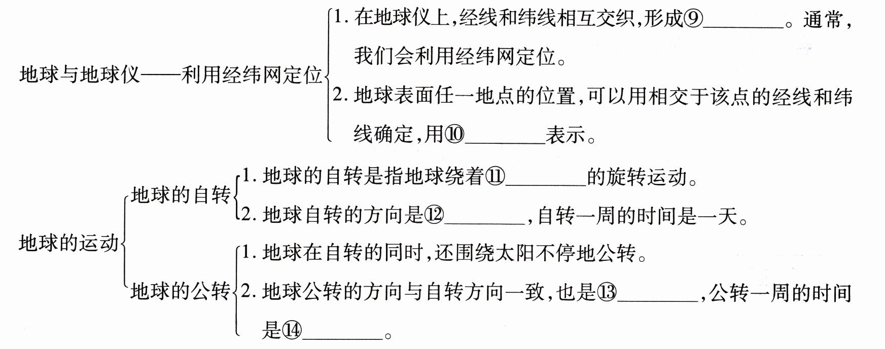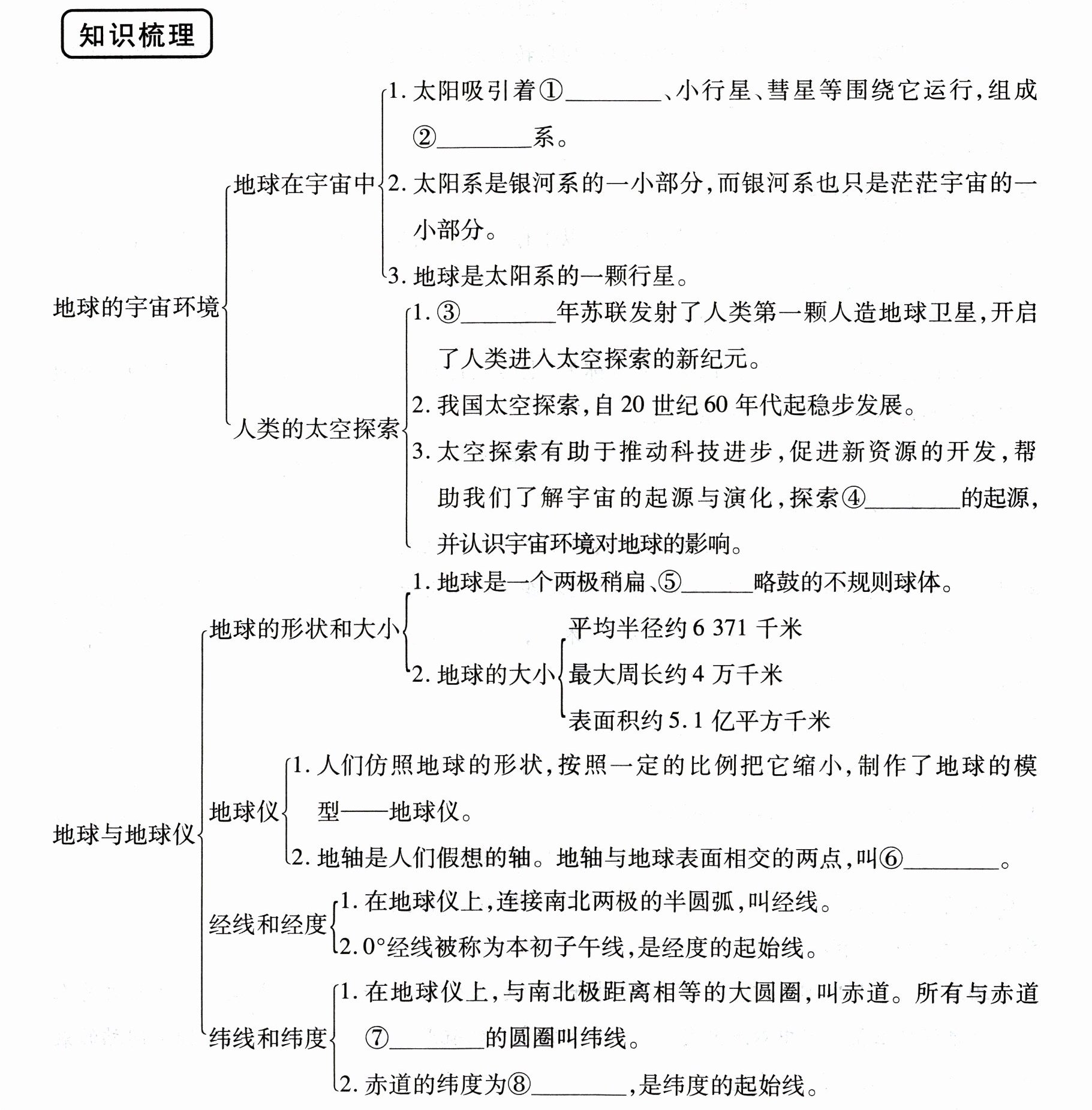 ①行星 ②太阳 ③1957 ④生命 ⑤赤道 ⑥两极 ⑦平行 ⑧0° ⑨经纬网 ⑩经纬度 ⑪地轴 ⑫自西向东 ⑬自西向东 ⑭ 一年
