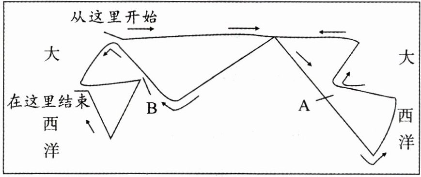 12. 为了让学生更快、更好、更准确地记住世界海陆分布状况及轮廓特征,某校老师在黑板上示范了“三笔画世界”。下图是老师已经画好的一笔。请你据此完成下列任务。