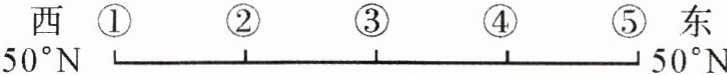 11. 下图是亚欧大陆自大西洋沿岸到太平洋沿岸(50°N)一线示意图,①、②、③、④、⑤分别表示五个地点。有关这五个地点降水量变化规律的说法正确的是 (