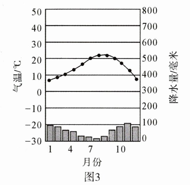 (3)根据图2和图3,指出适合种植油橄榄的地区的气候类型及其气候特征。