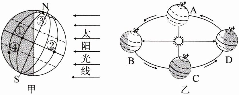 。(填字母)(4)A、B、C、D四点中,有阳光直射现象的是