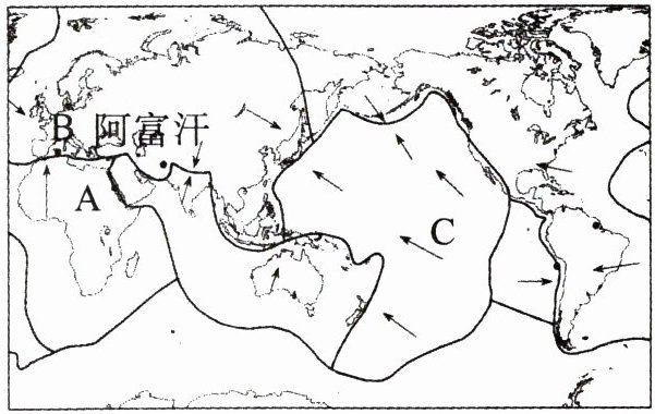 14. 阿富汗是地震多发的国家。2023年10月7日14时41分,在阿富汗发生6.2级地震,震源深度10千米,震中位于北纬34.70度,东经61.90度。随后发生一系列强烈余震。读“世界板块分布图”,完成下面题目。
