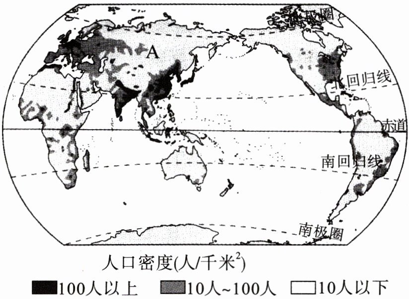 11. 世界人口分布很不均匀,有的地方人口稠密,有的地方人口稀疏。这样的分布特点与气候条件、海陆位置、地形地势等自然要素有着密切的联系。据图文资料,完成下列问题。