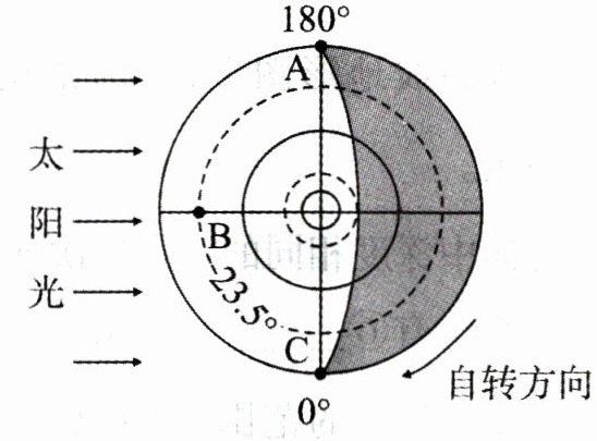 (4) 如图所示,A点正迎来______(填“日出”或“日落”),C点正迎来______(填“日出”或“日落”)。