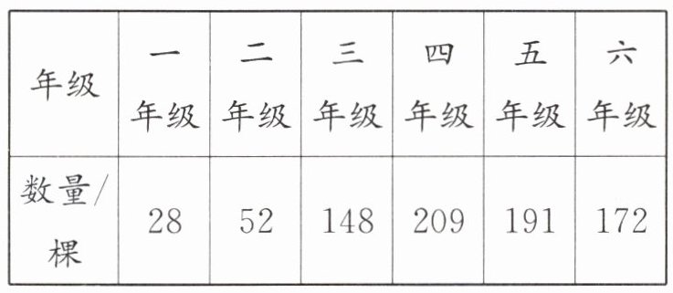 4. 植树节到了,育才小学举行了一次“为大地添绿衣”活动,下面是各年级植树情况统计表。