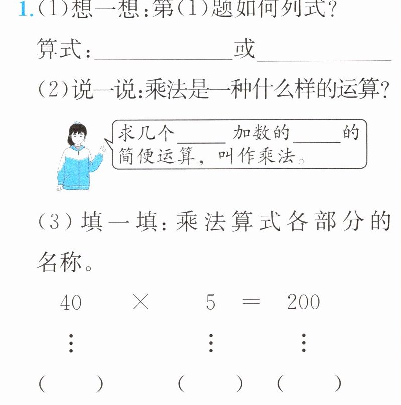 (1)实验小学四年级有 5 个班,每班 40 人,四年级一共有学生多少人?