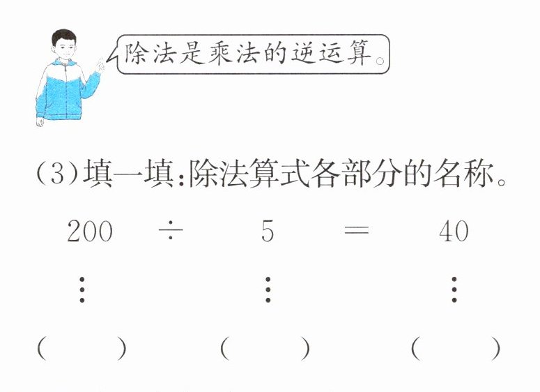 (3)实验小学四年级有学生 200 人,每班40 人,四年级一共有几个班?