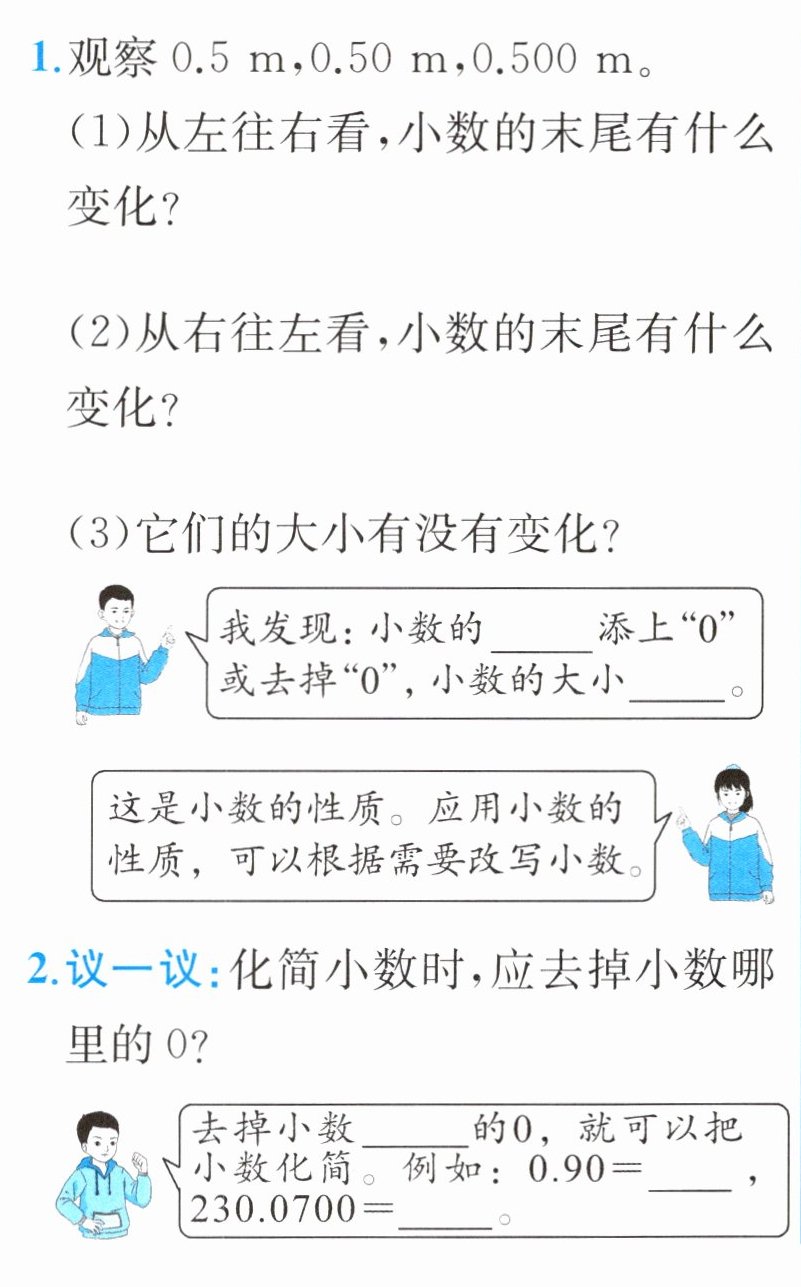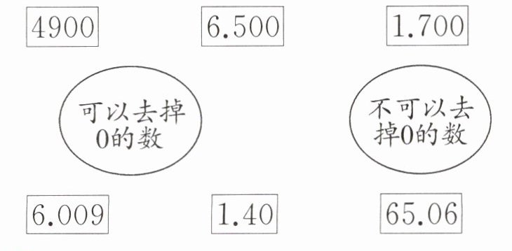 1. 可以去掉0的数:6.500 1.700 1.40 不可以去掉0的数:4900 6.009 65.06 2. 0.21 10.2 5.3 100.04 3. 2.800 3.070 10.140 0.500 28.000 100.000