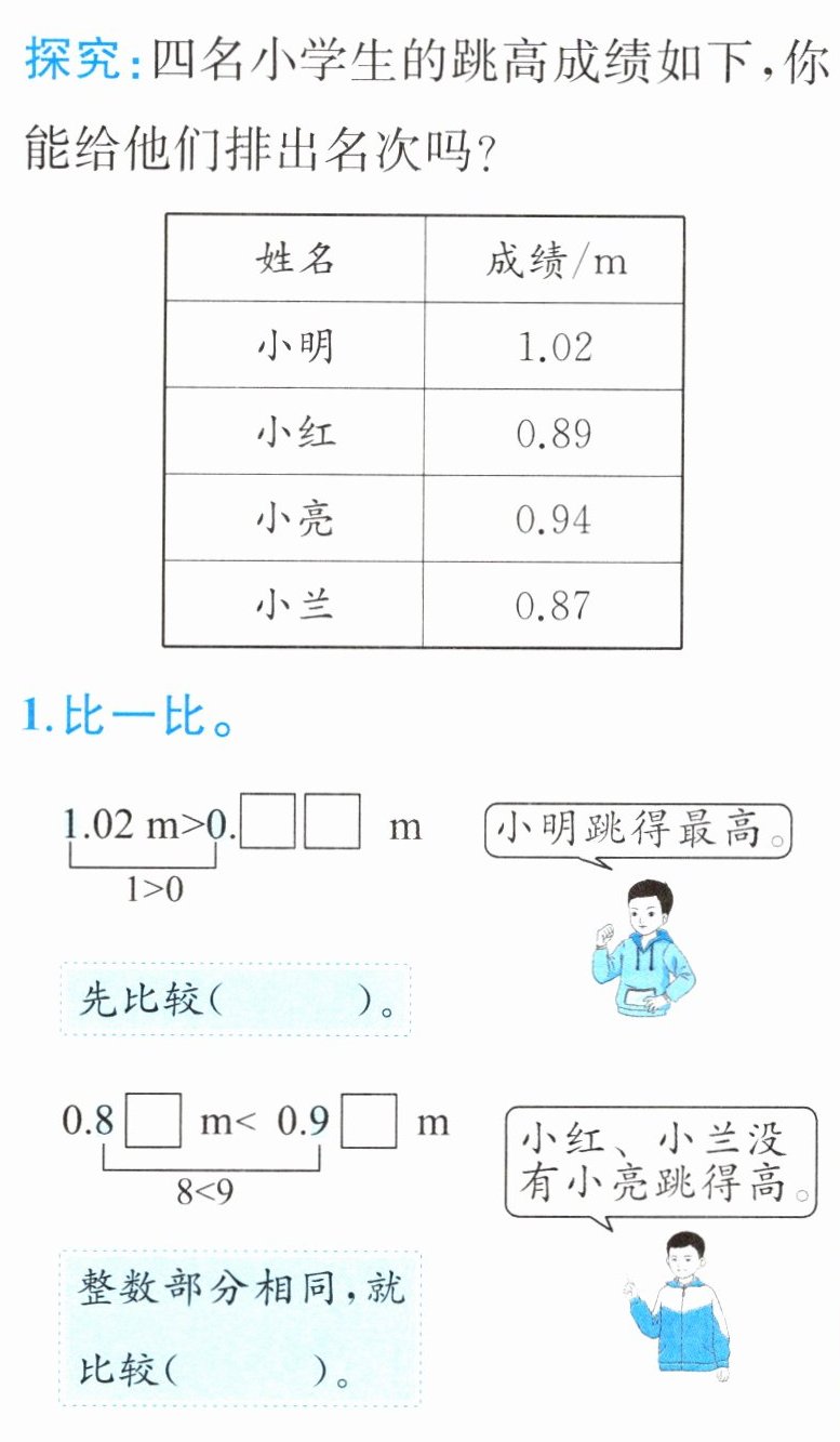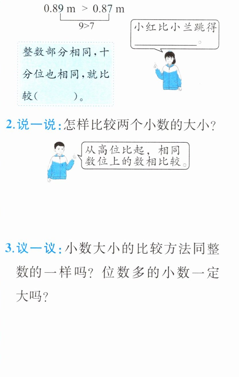 整数部分@@十分位@@高@@百分位@@先比较整数部分,再比较十分位、百分位……@@小数大小的比较方法同整数的一样,从高位比起。位数多的小数不一定就大。例如:4.256<4.3。
