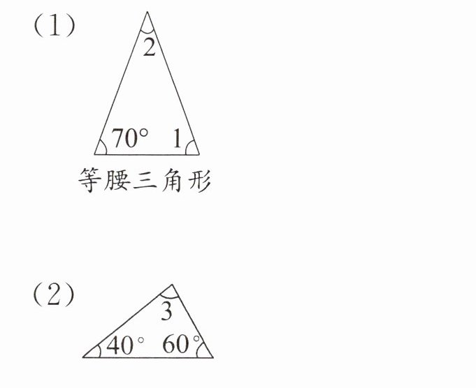 2. 求出下面三角形中未知角的度数。