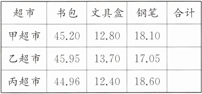 2. 小力准备购买书包、文具盒和钢笔。各超市三种文具的价格如下表,他在哪家超市购买最省钱?(单位:元)