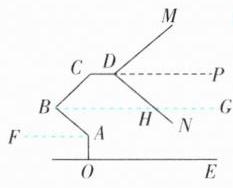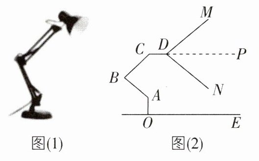 3新考法[2023浙江温州调研,较难]如图(1)是一盏可调节台灯,图(2)为示意图. 固定底座AO⊥OE于点O,BA与CB是分别可绕点A和B旋转的调节杆. 在调节过程中,灯体CD始终保持平行于OE,台灯最外侧光线DM,DN组成的∠MDN始终保持不变. 如图(2),调节台灯使光线DN//BA,此时∠BAO = 130°,且CD的延长线恰好是∠MDN的平分线,则∠MDN = ________。