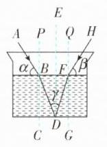 B【解析】如图,过点$B$,$D$,$F$分别作水面的垂线,则$PC// DE// QG$,所以$\angle BDE=\angle DBC$,$\angle FDE=\angle DFG$,所以$\angle BDF=\angle BDE+\angle FDE=\angle DBC+\angle DFG$。由题可得,$\angle DBC=\frac{3}{4}\angle ABP=\frac{3}{4}(90^{\circ}-\alpha)$,$\angle DFG=\frac{3}{4}\angle HFQ=\frac{3}{4}(90^{\circ}-\beta)$,所以$\angle BDF=\frac{3}{4}(90^{\circ}-\alpha)+\frac{3}{4}(90^{\circ}-\beta)=\frac{3}{4}(180^{\circ}-\alpha-\beta)$,即$\gamma = 135^{\circ}-\frac{3}{4}(\alpha+\beta)$,所以$\frac{3}{4}(\alpha+\beta)=135^{\circ}-\gamma$,故选B。
