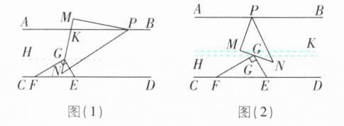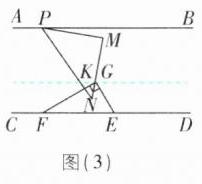 (2),过点$G$作$GH// AB$,过点$M$作$KM// AB$。因为$AB// CD$,所以$AB// CD// GH// KM$,所以$\angle FGH=\angle EFG = 30^{\circ}$,$\angle KMG=\angle HGM$,$\angle APM=\angle PMK$。因为$\angle EGN = 40^{\circ}$,$\angle EGF = 90^{\circ}$,所以$\angle KMG=\angle HGM = 180^{\circ}-90^{\circ}-40^{\circ}-30^{\circ}=20^{\circ}$。因为$\angle PMN = 90^{\circ}$,所以$\angle APM=\angle PMK = 90^{\circ}-20^{\circ}=70^{\circ}$。如图
