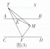(3),过$T$作$TS// AB$。设$\angle MFD = x^{\circ}$。因为$FT$平分$\angle MFC$,所以$\angle CFT=\angle TFM=\frac{1}{2}(180^{\circ}-\angle MFD)=90^{\circ}-\frac{1}{2}x^{\circ}$。因为$TS// AB$,$AB// CD$,所以$TS// CD$,所以$\angle STF=\angle CFT = 90^{\circ}-\frac{1}{2}x^{\circ}$。由