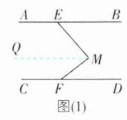 (1),过$M$作$MQ// AB$。因为$AB// CD$,所以$AB// MQ// CD$,所以$\angle EMQ=\angle BEM$,$\angle FMQ=\angle MFD$,所以$\angle EMQ+\angle FMQ=\angle BEM+\angle MFD$,所以$\angle EMF=\angle BEM+\angle MFD$。