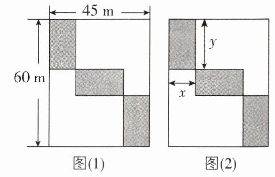 (1)设小长方形的宽为$m$ m,长为$n$ m。依题意有$\begin{cases}m + 2n = 60\\2m + n = 45\end{cases}$,解得$\begin{cases}m = 10\\n = 25\end{cases}$。 答:小长方形的相邻两边长分别是10 m和25 m。