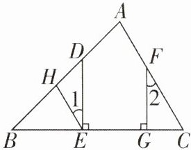 7[2024浙江丽水期末]如图,点D,F分别在三角形ABC的边AB,AC上,过点D作DE⊥BC于点E,过点F作FG⊥BC于点G,点H在BD上,连结HE,使∠1 = ∠2,试说明HE//AC.