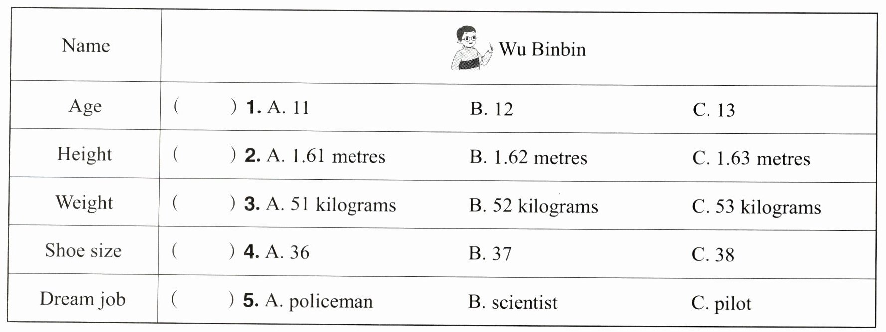 二、Listen and choose. 听短文,选择合适的选项,完成 Wu Binbin 的信息表。(5 分)