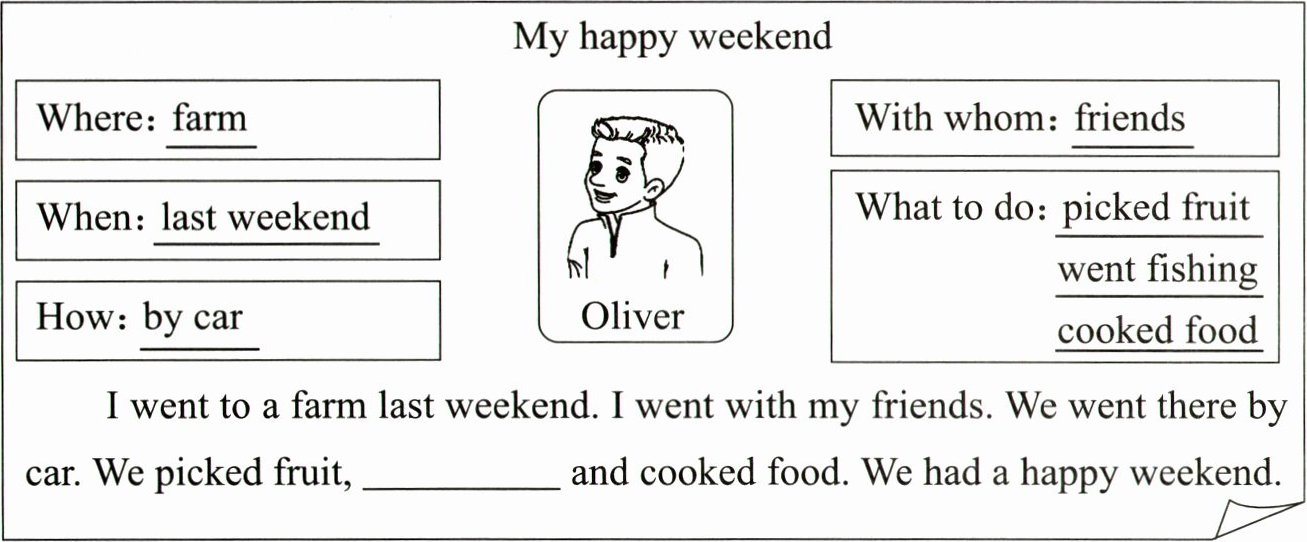 went fishing@@wonderful@@the zoo@@I went there with my parents. We went there by bus. We watched pandas, fed monkeys and had a picnic there. We had a wonderful weekend.(答案不唯一)