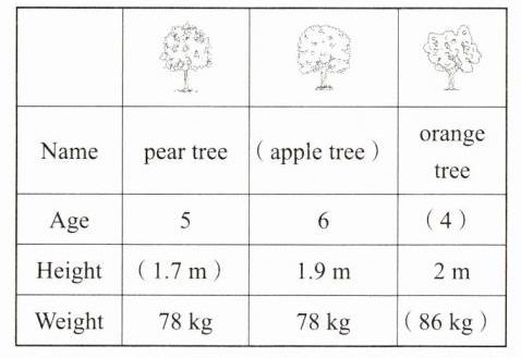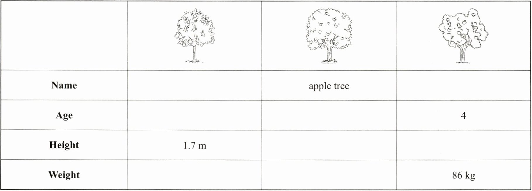 centimetres shorter than the orange tree. The orange tree is 8 kg heavier than the pear tree and the apple tree.